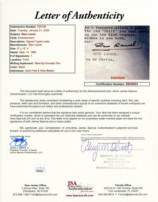 Stan Laurel Signed Letter "Way Out West, Block-heads, & A Chump at Oxford" JSA!