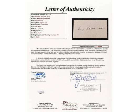 President Benjamin Harrison Signed Cut JSA Auto - A Perfect Example!