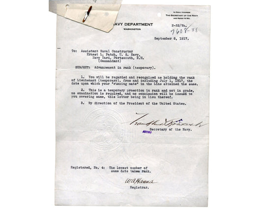 President Franklin D. Roosevelt Signed Letter Wartime (WWI) Promotion to Lt. PSA