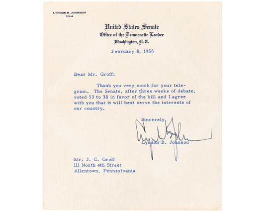 President Lyndon B. Johnson Signed Letter on Natural Gas Deregulation Bill JSA