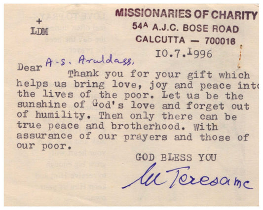Saint Mother Teresa "Missionaries of Charity" Signed Letter PSA