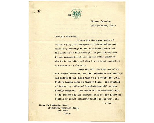 Canada P.M. ARTHUR MEIGHEN Signed Letter "Better Canadians...racial animosity"