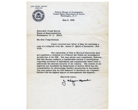FBI Dir. J. Edgar Hoover Signed Letter on Harvard Vietnam Protest PSA