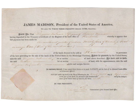 President JAMES MADISON Signed Mississippi / Alabama Land Grant JSA Auto